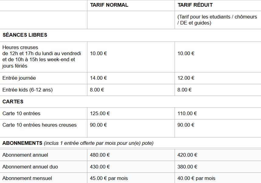 * Les tarifs Heures Creuses sont applicables si vous grimpez dans la plage horaire "heures creuses" mentionnée ci-dessus.